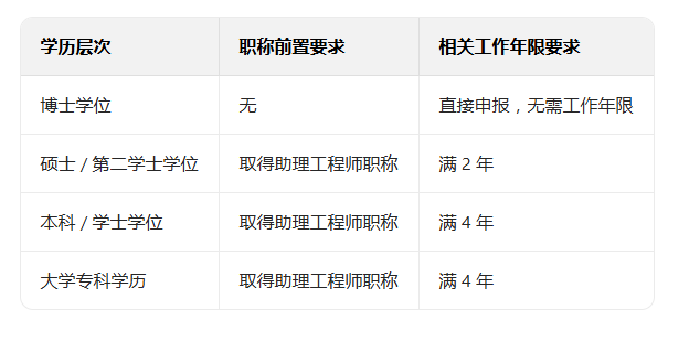 需同时满足学历、职称及工作年限要求,具体对应关系如下: